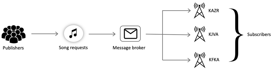 Let’s image that we want to employ a publish-subscribe pattern to support song requests from radio listeners across the country. Multiple radio stations will be able to subscribe to the incoming requests and add them to their playlists.